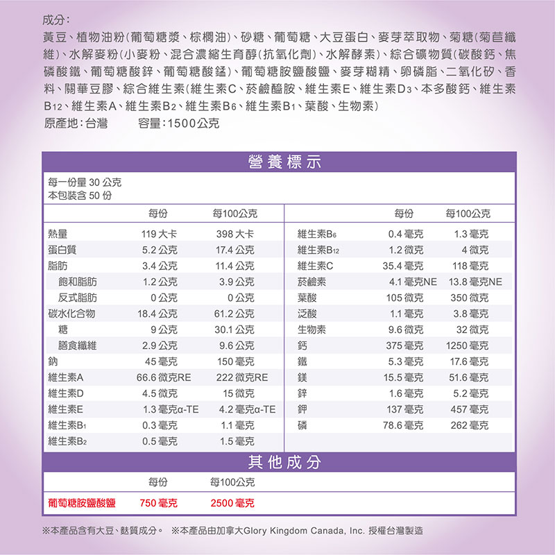 葡萄糖胺高鈣高纖配方 NT$730 / 810公克(罐) NT$1,180 / 1500公克(罐) 產品介紹 每2杯提供1500mg 美國專利素食葡萄糖胺 高鈣+維生素D配方 三大營養素符合每日飲食指南 全素可食 適用對象:全素者、青壯年、銀髮族、運動員、病後補養之營養補充品 使用建議:每日2杯,取3匙+180毫升溫冷開水罐 文章導覽 Previous 雙優蛋白葉黃素配方 Next 葡萄糖胺橄欖果EX配方